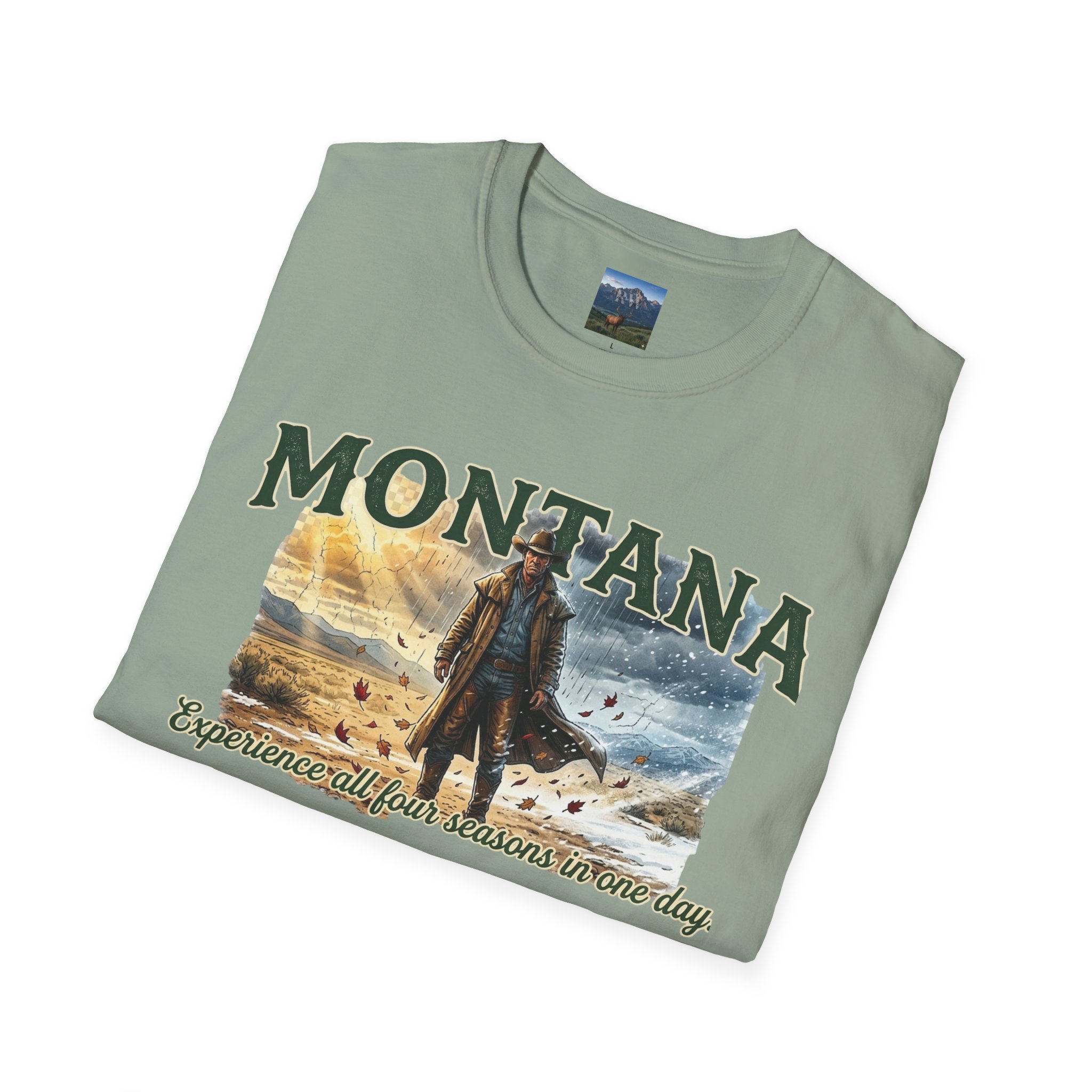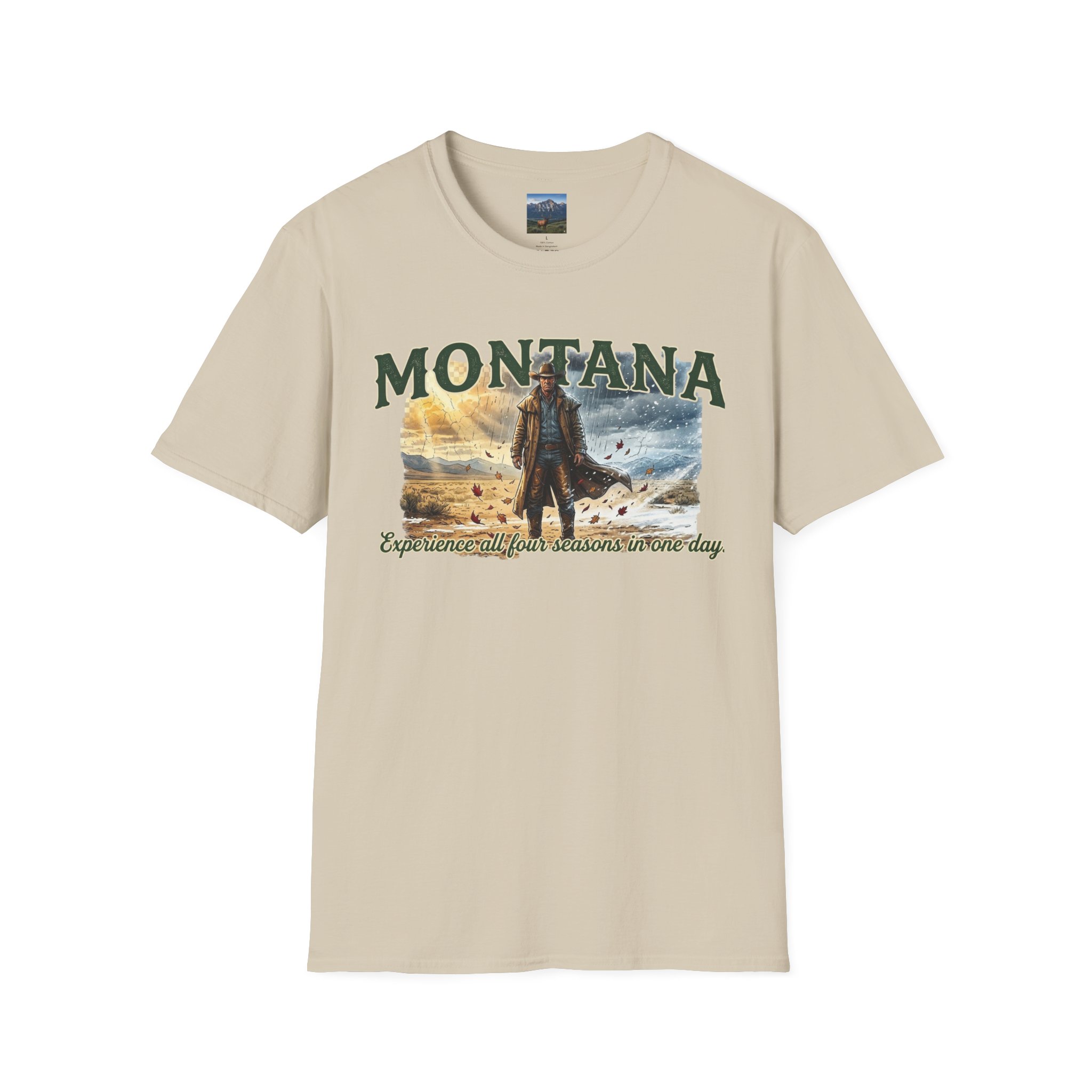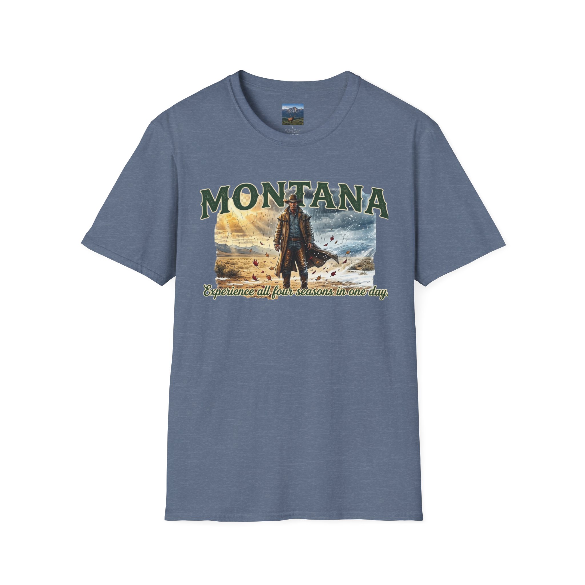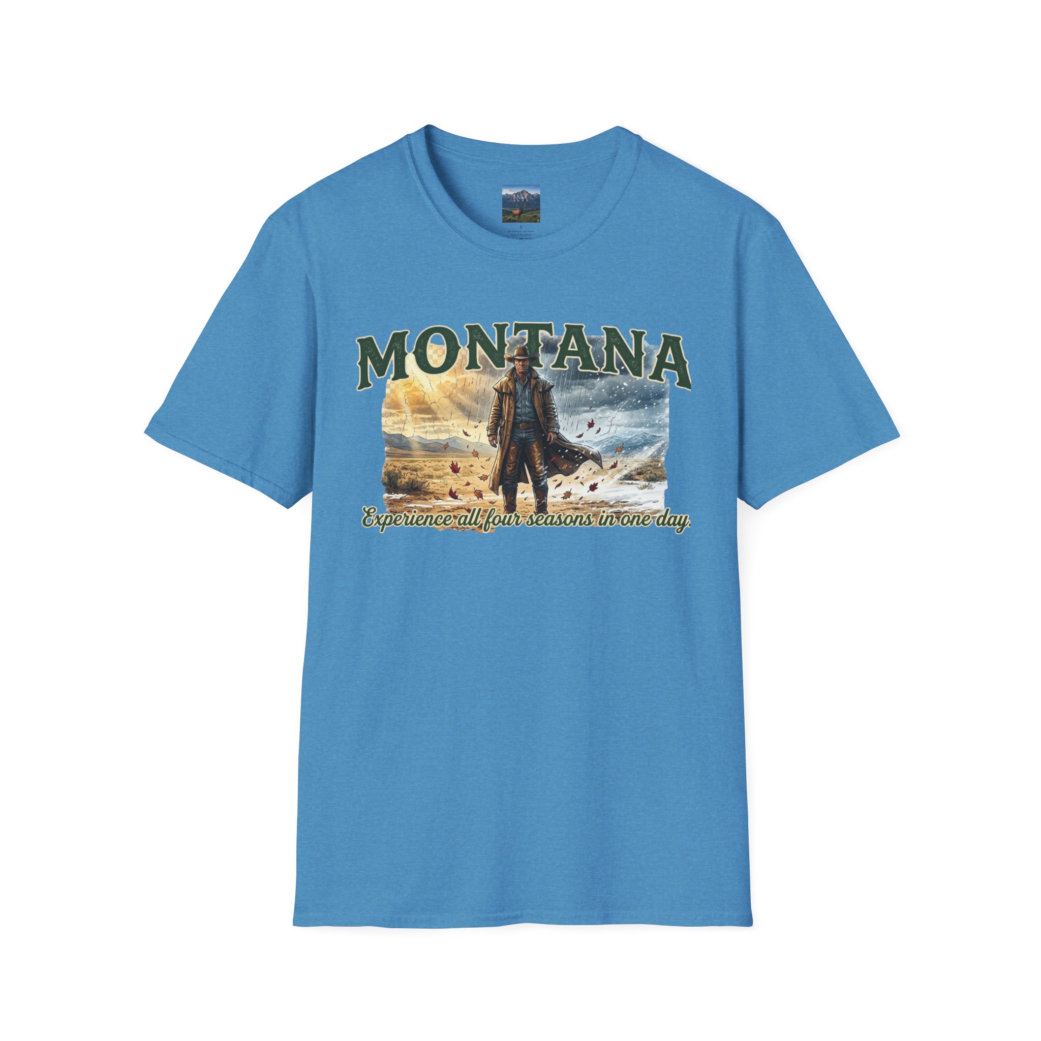 This lightweight cotton tee carries the wide-open skies of Montana and the unpredictable thrill of a day that moves through all four seasons. Soft against the skin, it drapes casually over a flannel or under a worn denim jacket, ready for sunrise rides, sudden mountain sleet, or warm late-afternoon trails. The design speaks to folks who chase changing weather and wide horizons — cowboys, road-trippers, and anyone who lives for that Montana stretch where you can taste spring rain at noon and catch a winter gust by sunset. Wear it on weekend escapes, campfire nights, or long drives down backcountry roads — it settles in naturally with lived-in layers and keeps its shape through the miles.
