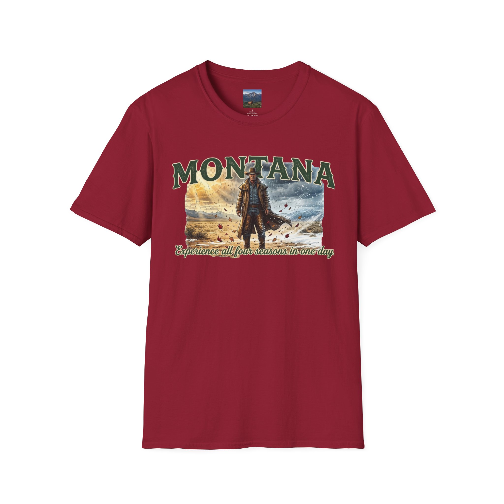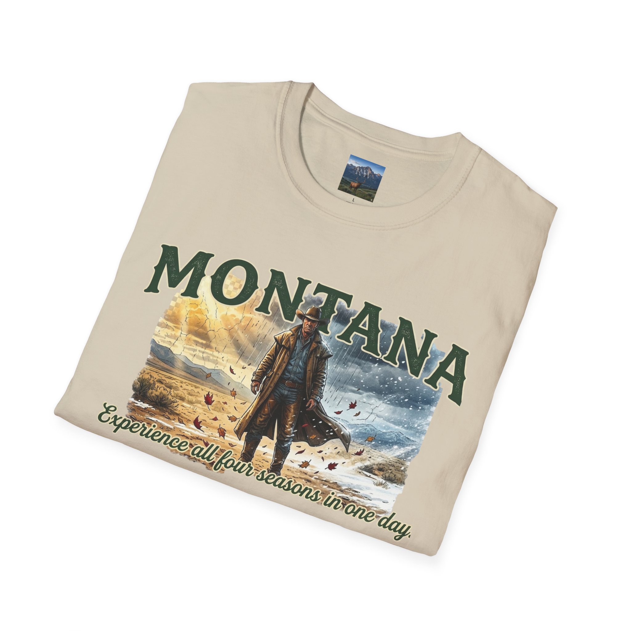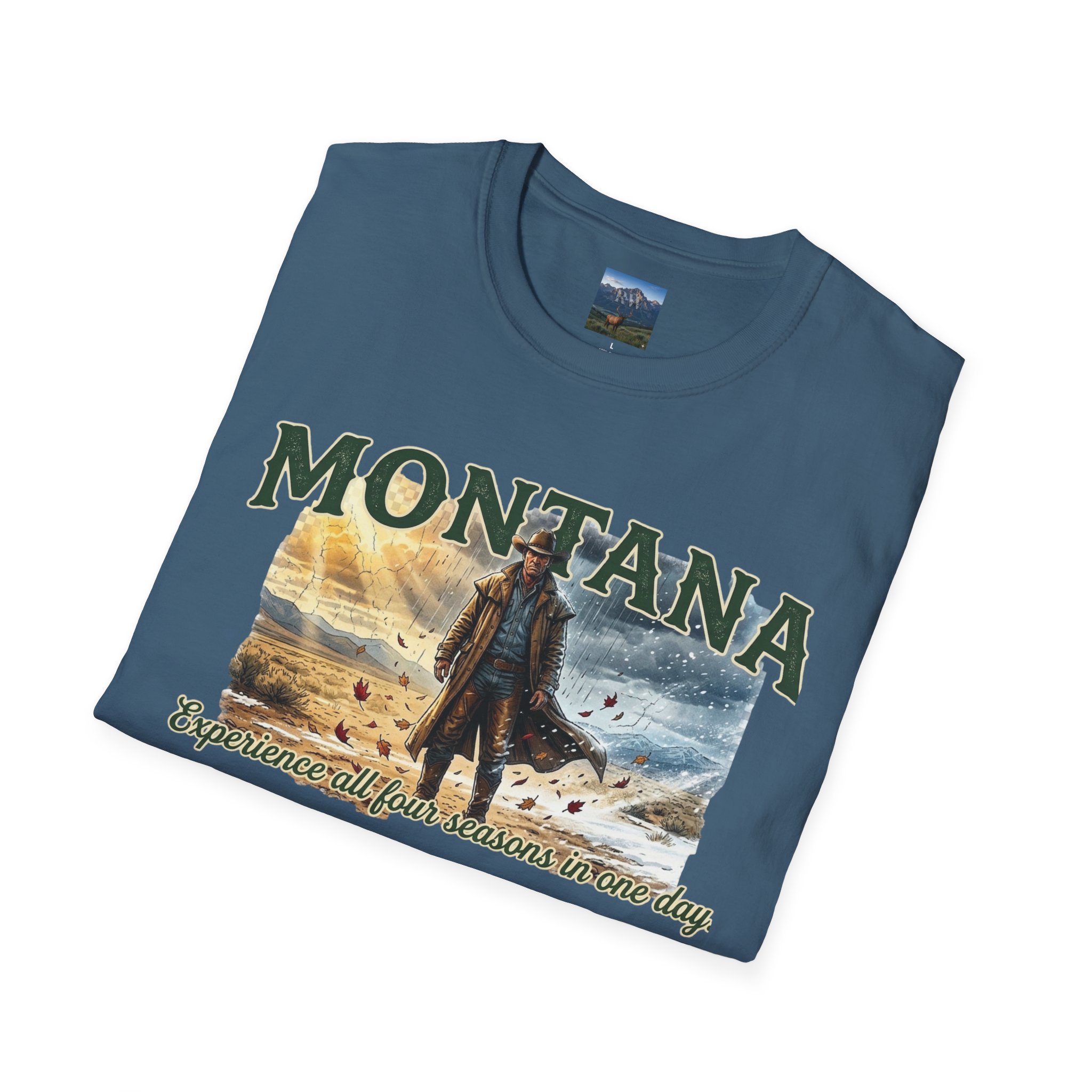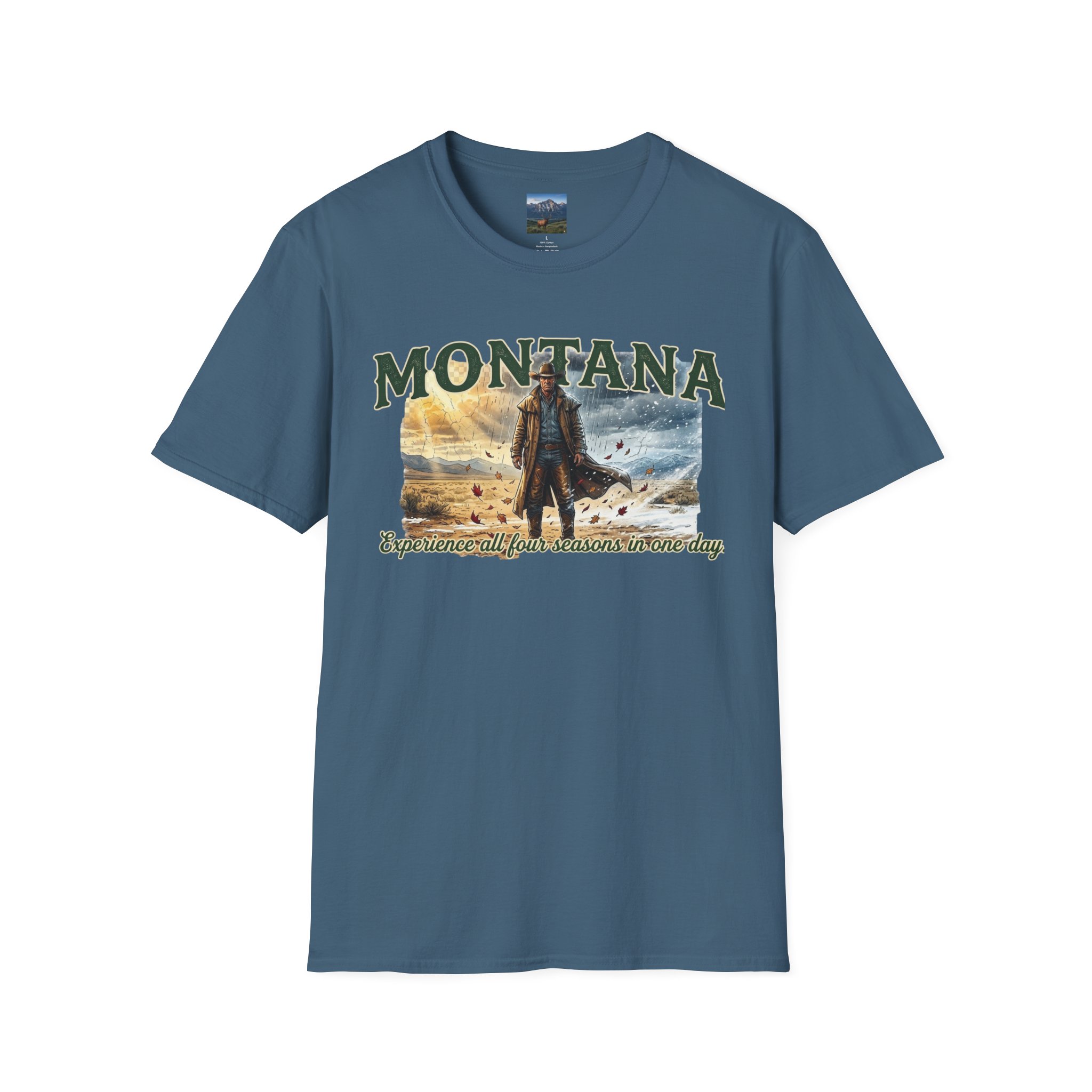 This lightweight cotton tee carries the wide-open skies of Montana and the unpredictable thrill of a day that moves through all four seasons. Soft against the skin, it drapes casually over a flannel or under a worn denim jacket, ready for sunrise rides, sudden mountain sleet, or warm late-afternoon trails. The design speaks to folks who chase changing weather and wide horizons — cowboys, road-trippers, and anyone who lives for that Montana stretch where you can taste spring rain at noon and catch a winter gust by sunset. Wear it on weekend escapes, campfire nights, or long drives down backcountry roads — it settles in naturally with lived-in layers and keeps its shape through the miles.