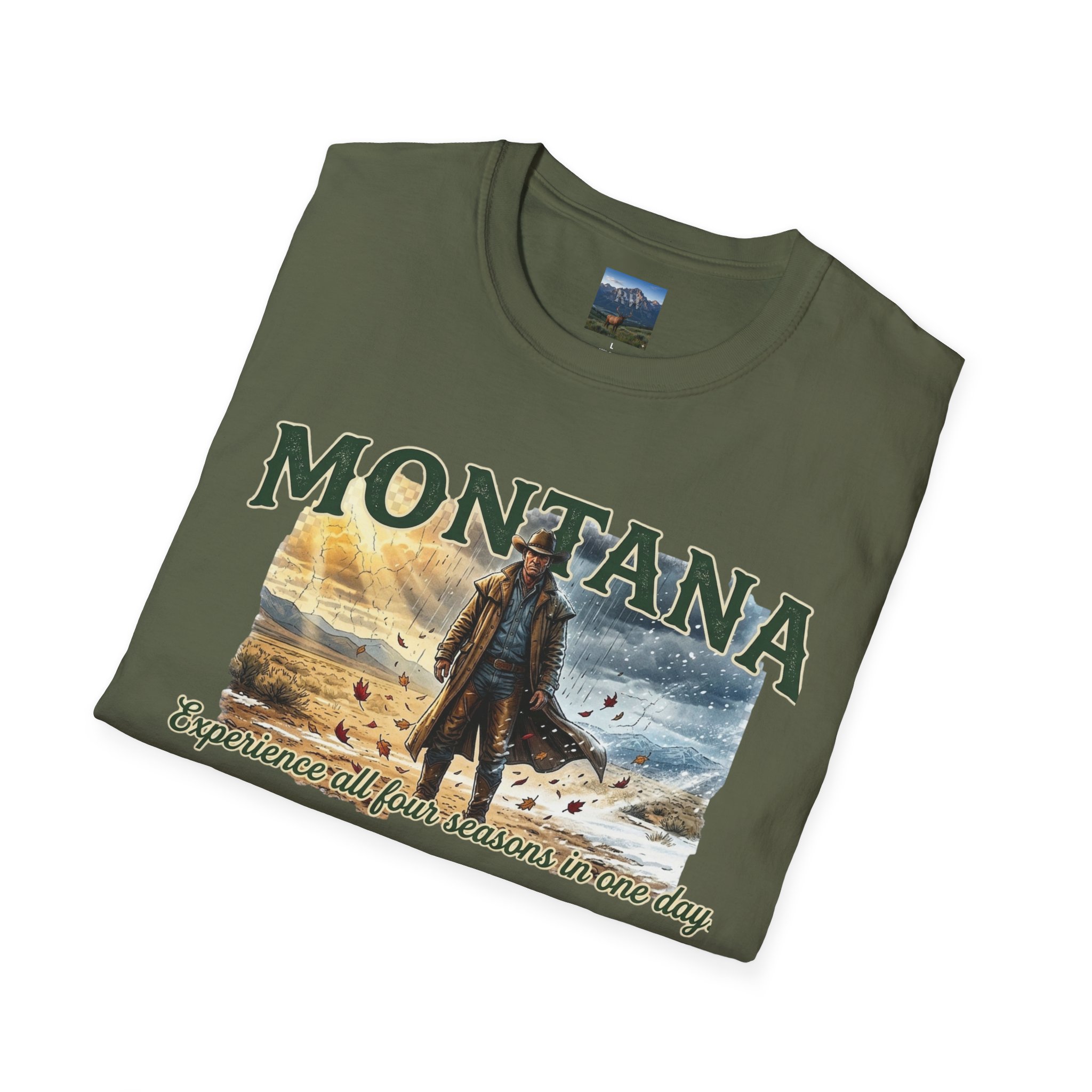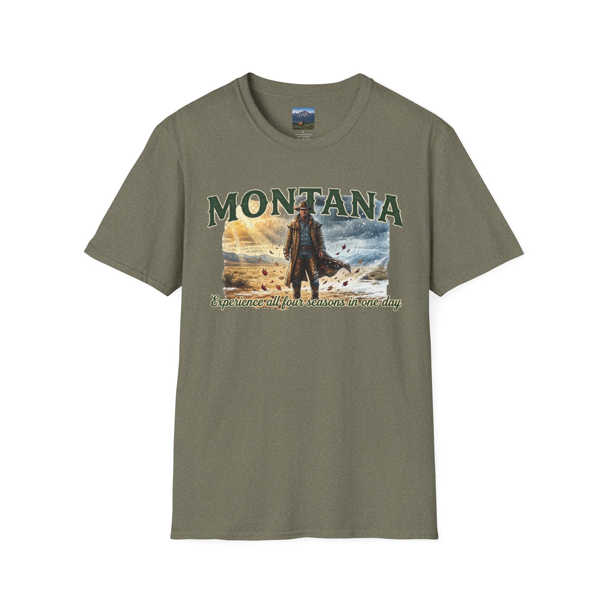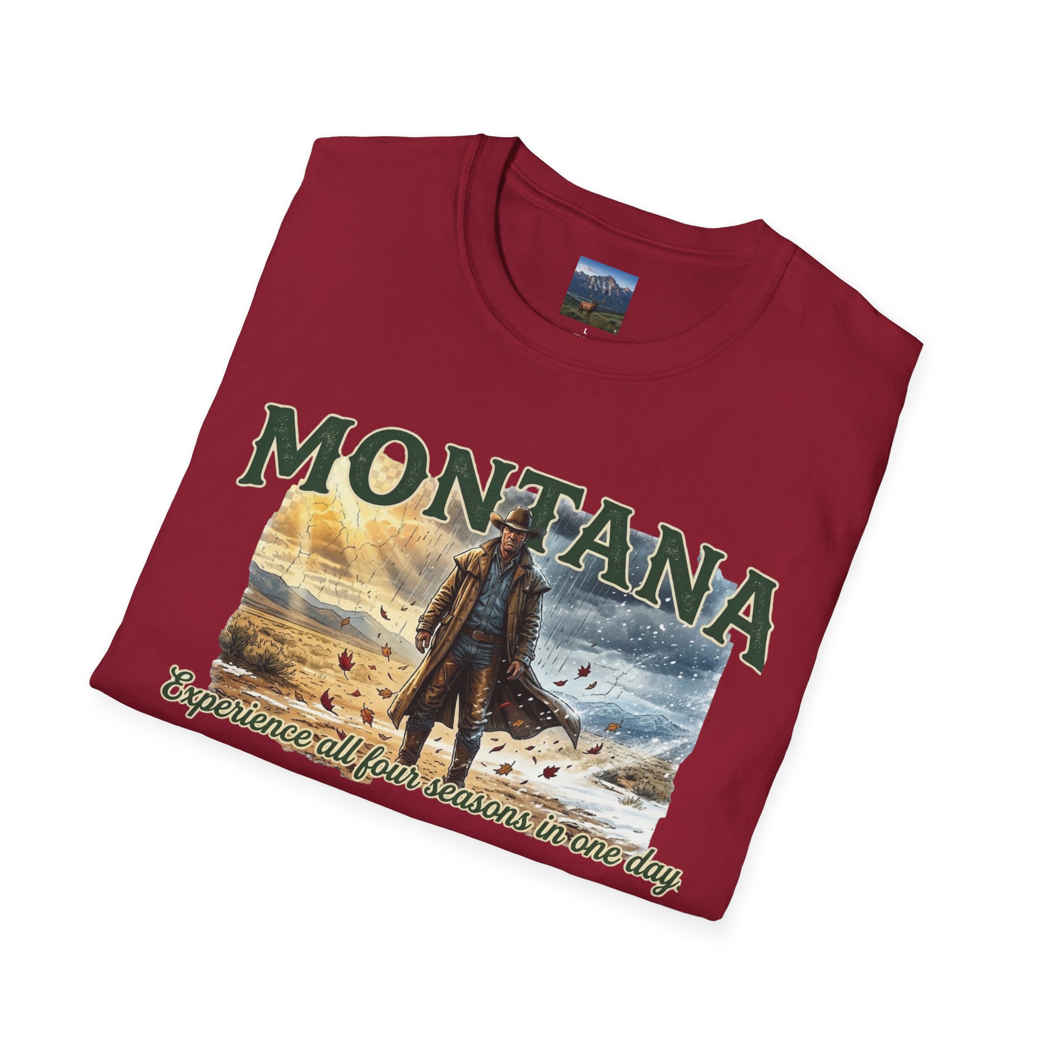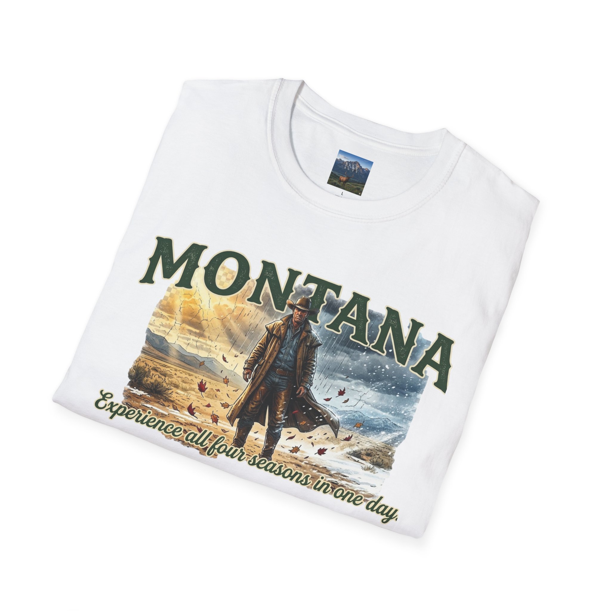 This lightweight cotton tee carries the wide-open skies of Montana and the unpredictable thrill of a day that moves through all four seasons. Soft against the skin, it drapes casually over a flannel or under a worn denim jacket, ready for sunrise rides, sudden mountain sleet, or warm late-afternoon trails. The design speaks to folks who chase changing weather and wide horizons — cowboys, road-trippers, and anyone who lives for that Montana stretch where you can taste spring rain at noon and catch a winter gust by sunset. Wear it on weekend escapes, campfire nights, or long drives down backcountry roads — it settles in naturally with lived-in layers and keeps its shape through the miles.